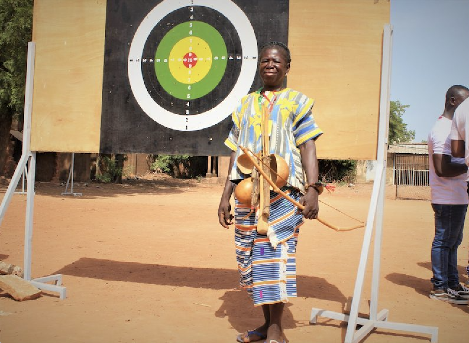 Salamata Kambou, la trentaine, s’avance, son arc à la main. Elle s’arrête un instant, observe, arme et d’un coup, la flèche se décolle de sa main. C’est raté. Deuxième tentative. Le tableau est atteint mais ne donne pas de points.  Elle arme une troisième fois. Cette fois, elle a 1 point. La mine grise, Salamata rejoint sa place non sans s’être accordée avec le jury sur sa performance du jour.